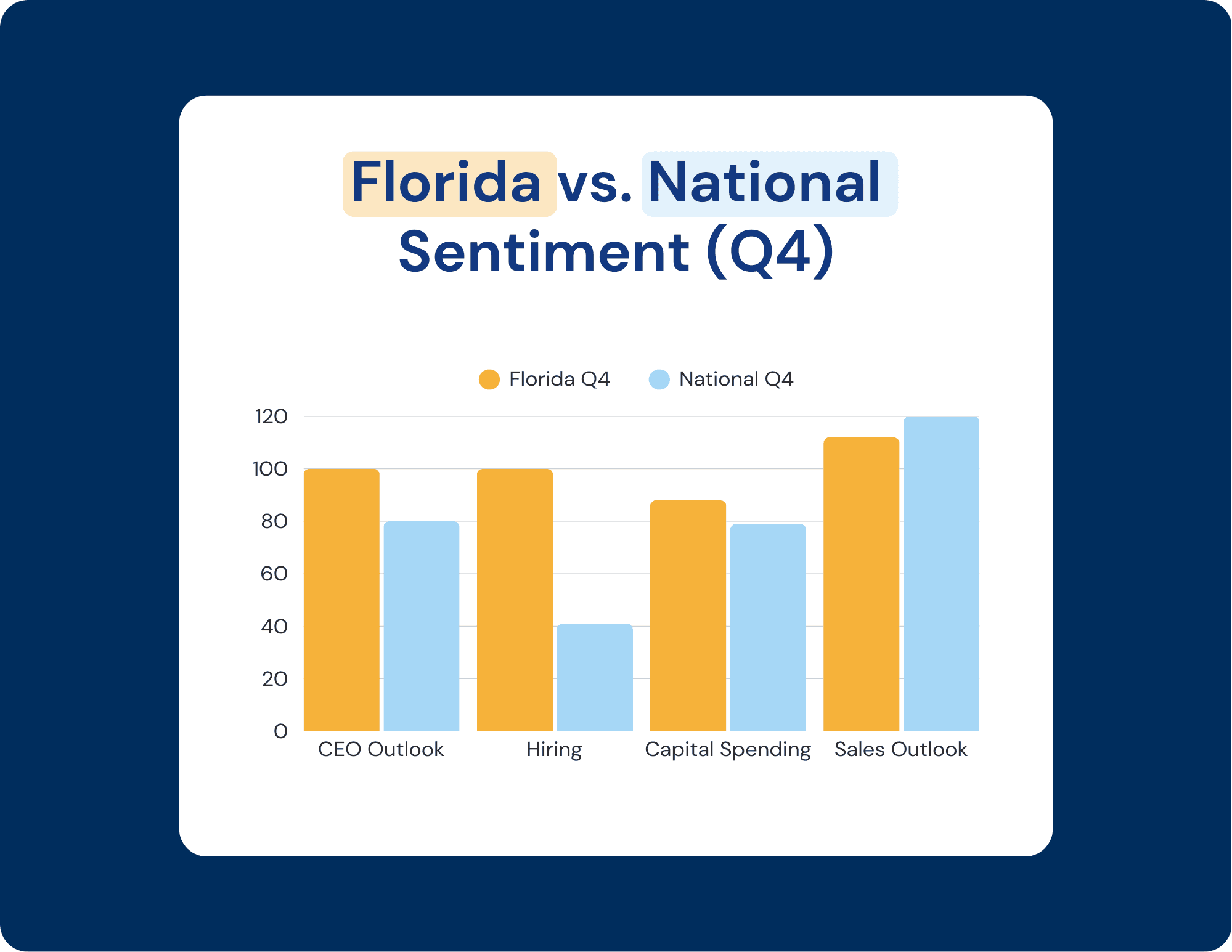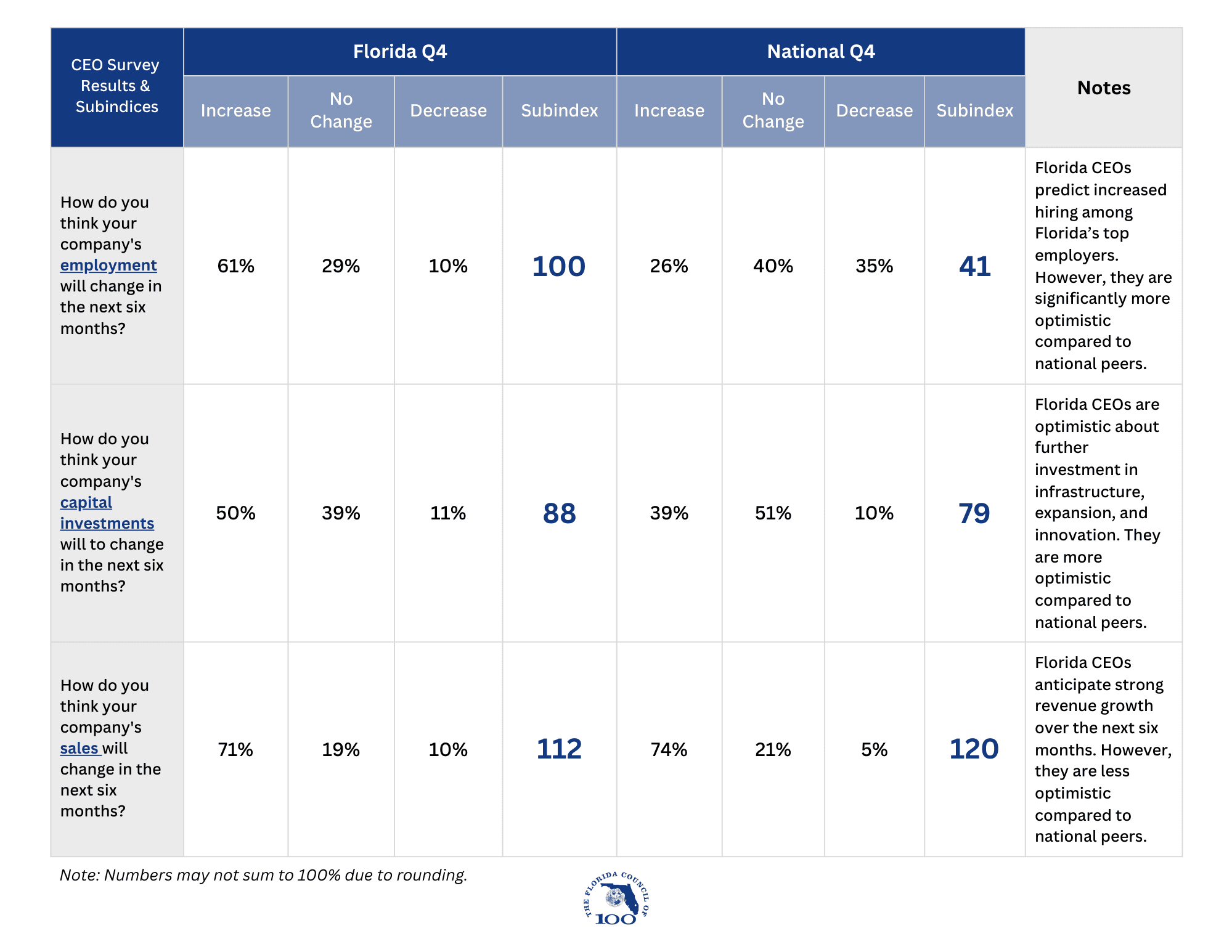 “Florida CEOs are sending a clear signal that they expect continued job growth and economic expansion,” said George LeMieux, Chair of The Florida Council of 100. “This quarter’s results reflect confidence in Florida’s workforce, business climate, and long-term growth prospects.”