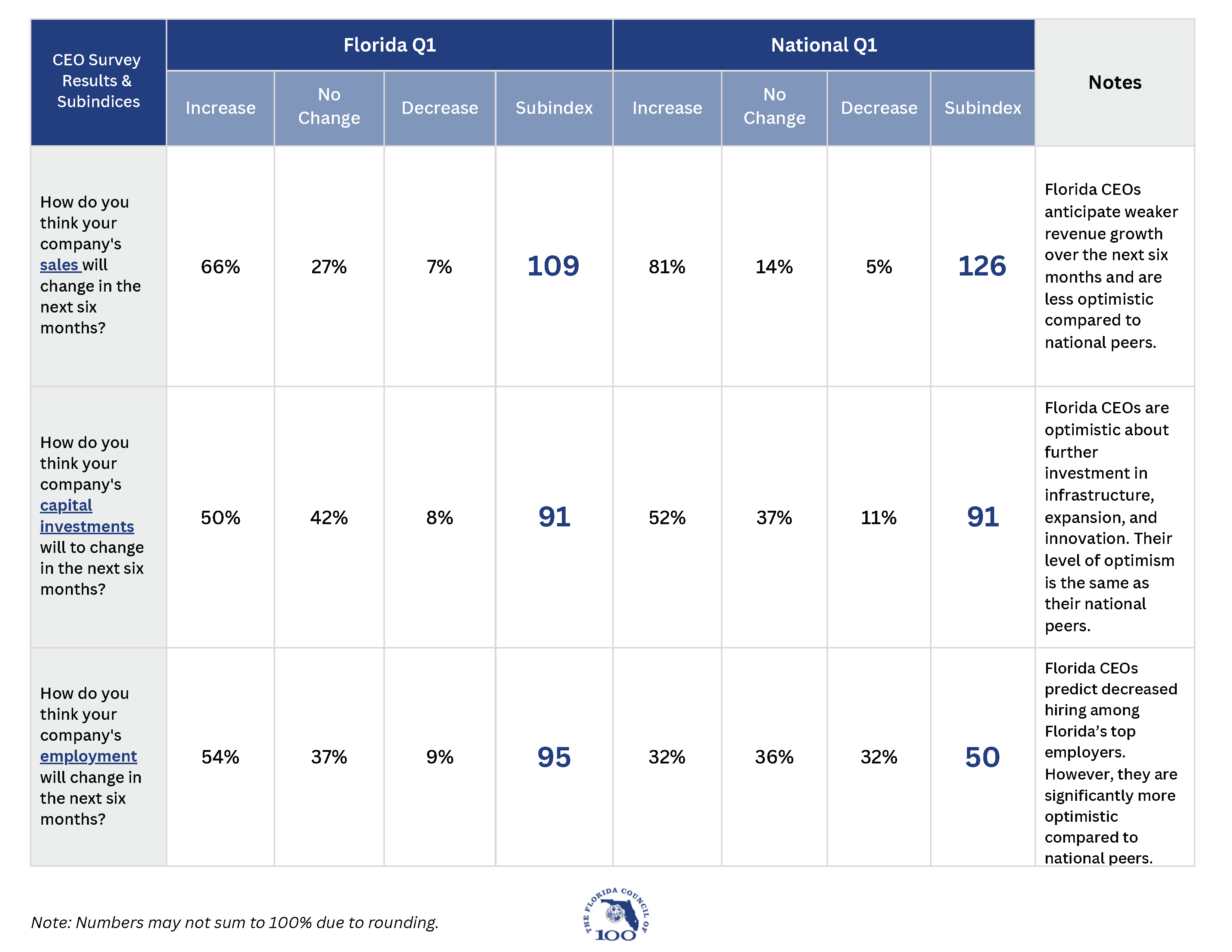 The Florida Council of 100 brings together the state’s top business leaders to align around the policies, investments, and strategies shaping Florida’s long-term economic growth. The Council’s CEO Economic Outlook Index captures real-time insight from its members, reflecting the decisions and priorities of leaders actively shaping the state’s economy.